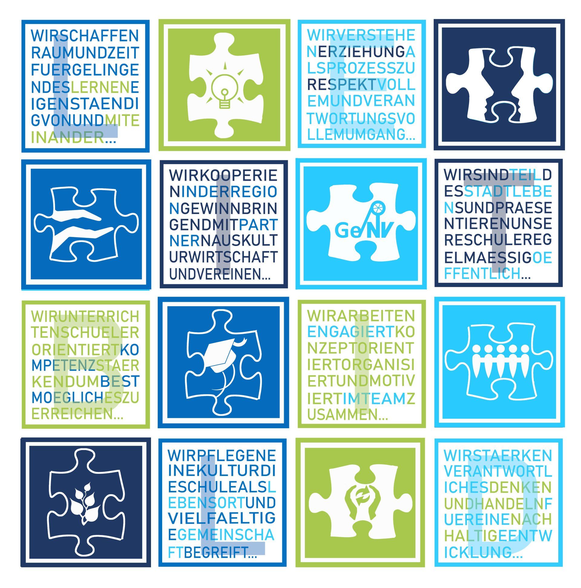 Neben diesen szenischen Präsentationen gab es auch jede Menge “Stationäres” zu sehen. Im Laufe des Schuljahres hatte sich eine jahrgangsübergreifende Projektgruppe um Gregor Pickers und der Künstlerin Jen Satora intensiv mit der Visualisierung der acht Leitsätze für die Schule, die im Vorjahr verabschiedet worden waren, beschäftigt. Dabei entstand für jeden Leitsatz ein Quadrat, die acht Quadrate wurden zusammen mit passenden Piktogrammen zu einem 4x4-Gesamt-tableau kombiniert. Neben dem Gesamttableau, das nun an zentraler Stelle in der Schulstraße hängt, finden sich die Leitsätze auch als Fassadenelemente an verschiedenen Stellen des Schulgebäudes. Man kommt sich umhin sie zu sehen und immer wieder als Gedankenanstoß wahrzunehmen!