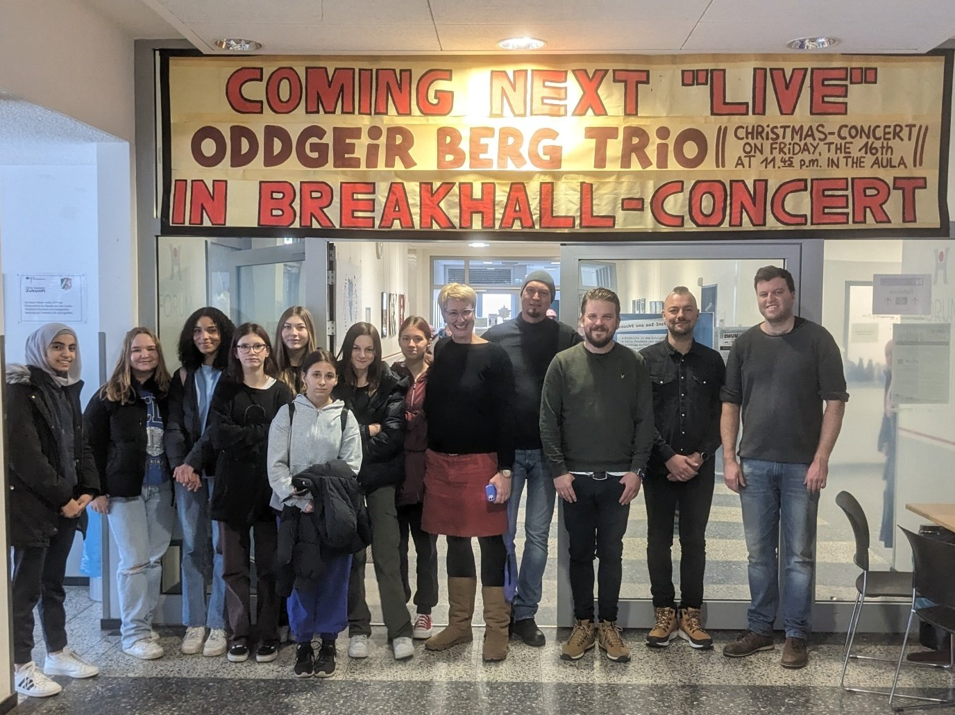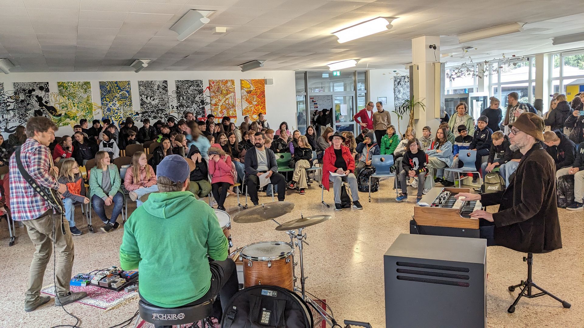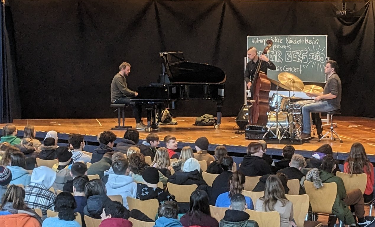 16. August 2023 Schon eine Woche nach Schulbeginn gab es das erste Pausenhallenkonzert mit der international besetzten Avantgardeband KATOM aus der Schweiz. Das durch Rüdiger Eichholtz, den Kulturbeauftragten der Stadt NV, entwickelte Format der Pausenhallenkonzerte geht in sein 6. Jahr. Die Vereinsstruktur Kulturprojekte Niederrhein e.V. organisiert die Events und die Sparkassen-Kulturstiftung Neukirchen-Vluyn hat die Idee von Beginn an gefördert. In dieser Reihe waren Weltstars wie David Friedman und Günter Baby Sommer zu Gast.