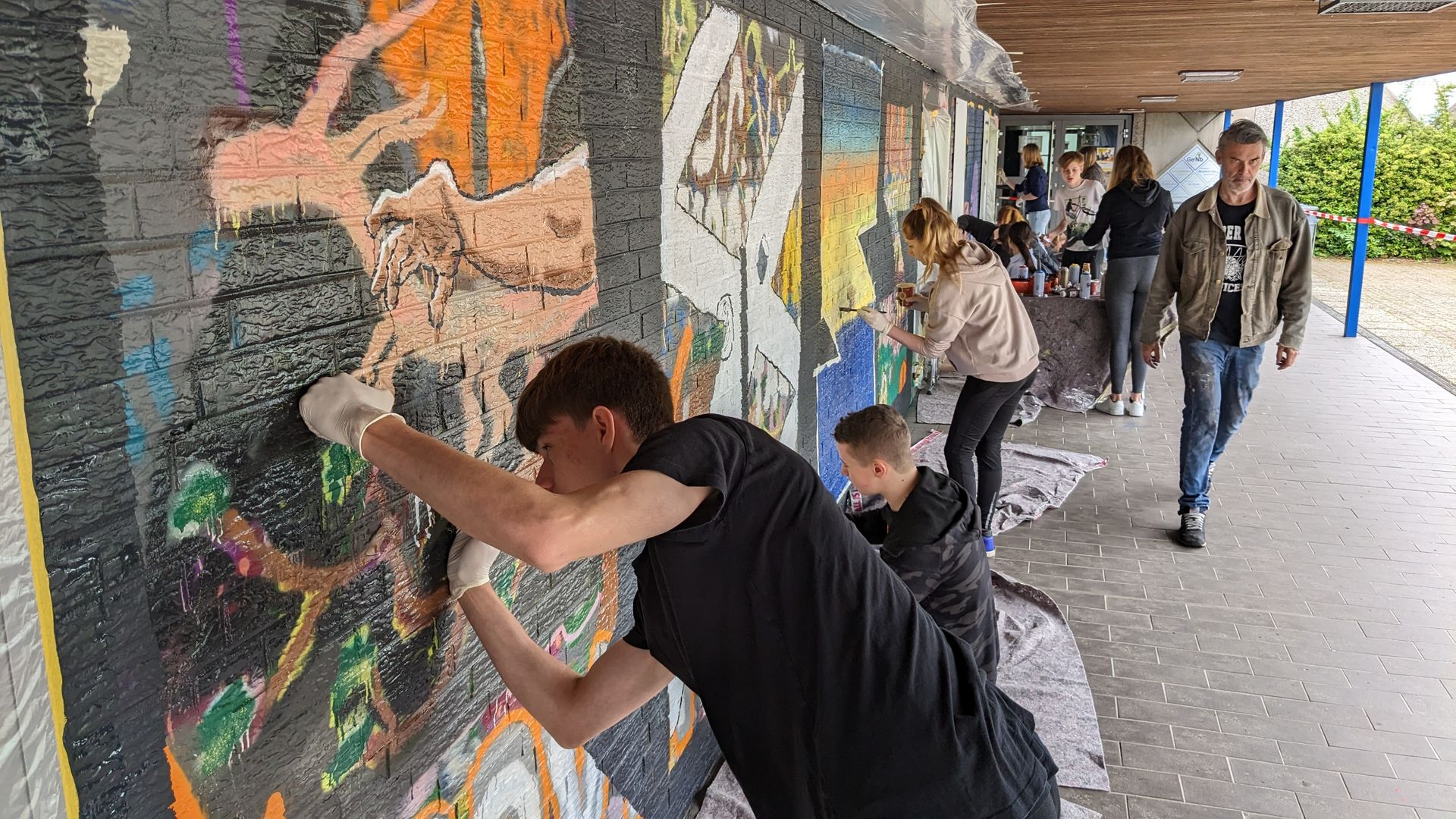 Neukirchen-Vluyn Es weht ein bisschen internationale Luft um das Gesamtschulgebäude. Tief versunken stehen Schüler der 8. bis 10. Jahrgangsstufen vor bunt besprühten Außenwänden. Angeleitet von dem international renommierten Graffiti Künstler Case, der extra für dieses Kunstprojekt aus Frankfurt angereist kam. Er nimmt sich für jeden Schüler Zeit, leitet diese an, zeigt, wie man die Sprühdosen halten, worauf man bei der Gestaltung eines Großbildes achten muss.
