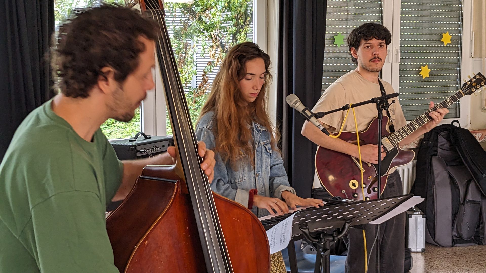 Der Gitarrist Silvan J. gewährt uns interessante Einblicke in die Welt eines Profimusikers, als er uns Folgendes erzählt: Wenn die Zuschauer*innen sich bei Auftritten mit etwas anderem beschäftigen, zum Beispiel am Handy sind, fühlt er sich nicht wohl und das schlägt aufs Selbstbewusstsein. Er wird dann sehr nervös, sodass er sich auch mal verspielen kann. Silvan hat außerdem erklärt, dass Jazz eine internationale Musik ist und er selber fünf bis sechs Stunden am Tag lernt. Silvan und Georgi (Kontrabass) spielen seit vier Jahren zusammen und wohnen auch zusammen in der Schweiz. Das ganze Trio verdient teilweise ihr Geld mit der Musik. Sie spielen öfters in kleinen Bars, wo es dann eher als Hintergrundmusik wahrgenommen wird. Doch wenn die Zuhörer*innen aufmerksam sind und sich auf die Musik voll und ganz einlassen, ist es die pure Freude für das Jazz-Trio.