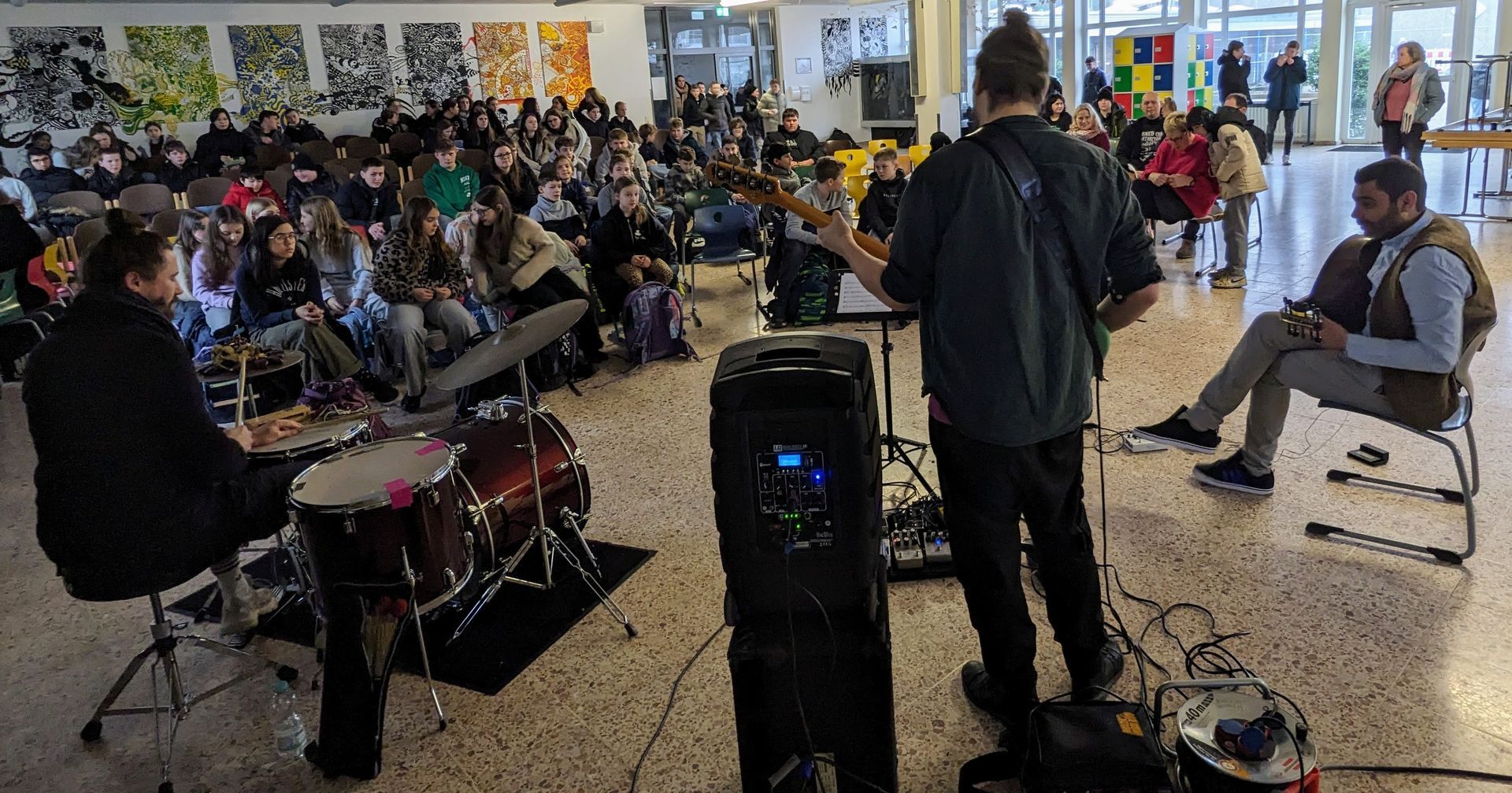 26. April 2023 Das durch Rüdiger Eichholtz, den Kulturbeauftragten der Stadt NV, entwickelte Format der Pausenhallenkonzerte geht in sein 5. Jahr. Die Vereinsstruktur Kulturprojekte Niederrhein e.V. organisiert die Events und die Sparkassen-Kulturstiftung Neukirchen-Vluyn hat die Idee von Beginn an gefördert. In dieser Reihe waren Weltstars wie David Friedman und Günter Baby Sommer zu Gast und heute stand für das Schulzentrum das GOLDSCHATZ TRIO auf der Aulabühne im Schulzentrum NV, ein Projekt mit Björn Steinhoff – Gitarre/Synthesizer/Gesang, Vasko Damjanov – Synthesizer/Gesang, Peter Härtel – Schlagzeug/Effektklänge.